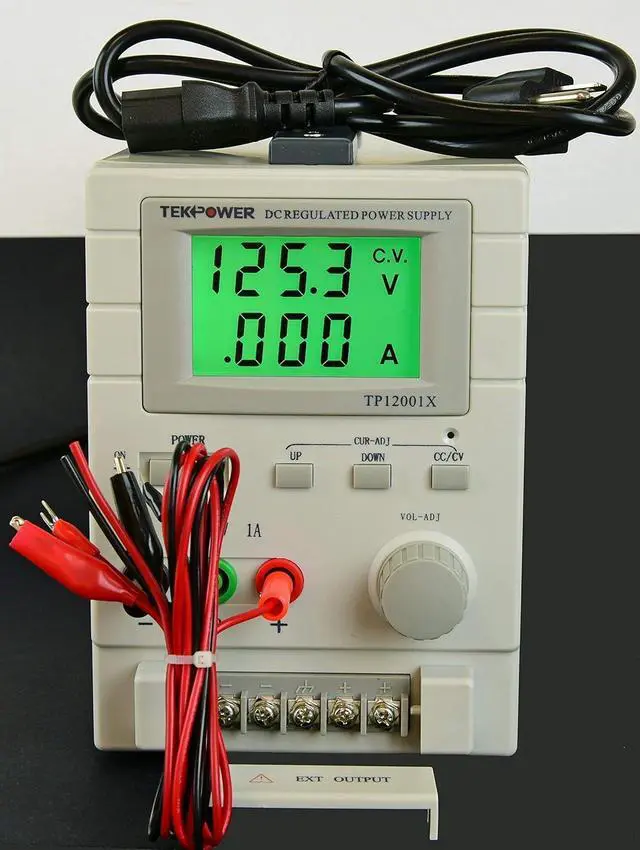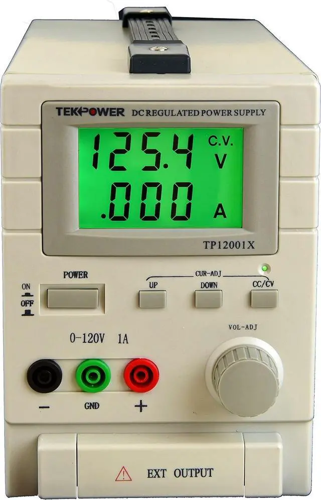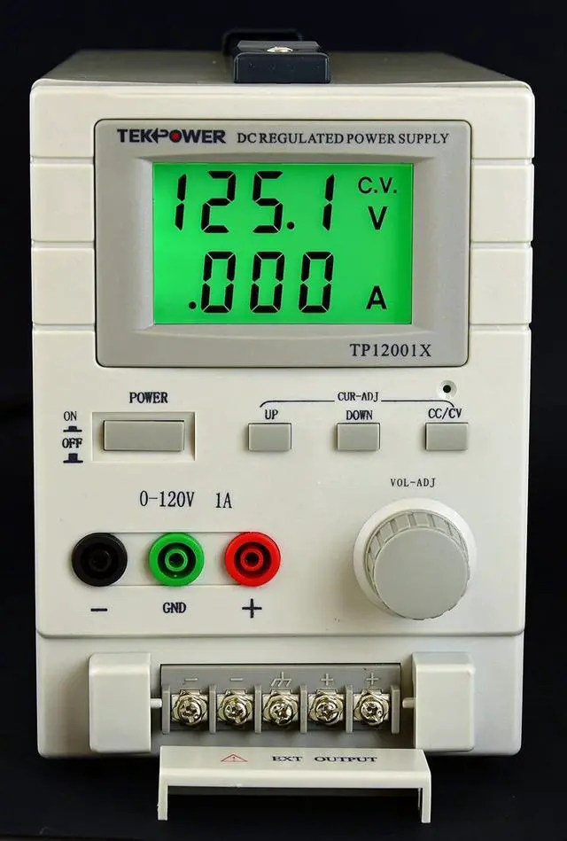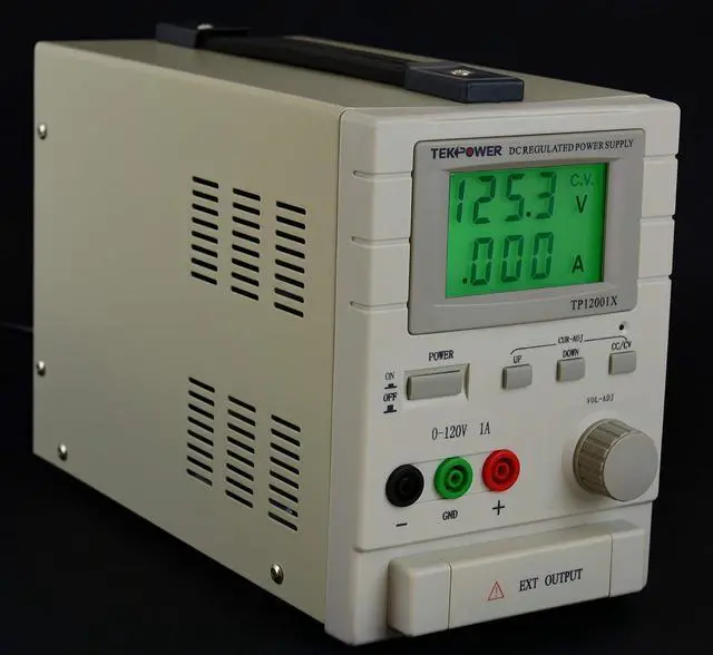 The TP120001X model is a professional DC regulated power supply from TekPower. This is a highly stable, high quality switching power supply with its output continuously adjustable at 0-120V DC @1 A.You can set up Constant Current. There is also an connector output on the front. This model is specifically designed with low ripple and noise. The unit comes with a large LCD display with back light, providing accurate readout for the voltage and current values. The automatically start air fan makes it work for a long time without over heating. It has a build in fuse protection and comes with basic 1 year USA warranty. Features & Specifications: Adjustable outputs: 0-120V @1 A Variable controls voltage outputs Input voltage: 110V Ripple noise: 100 mV Protection: Overload and overheat protection Environment: 0-40C, relative humidity <90% Size: 16 X 8 X 10 inches Weight: 14 lbs Warranty: 1 year Package: TP12001X Power Supply User Manual ,Cord and Cable Warranty Registration Card