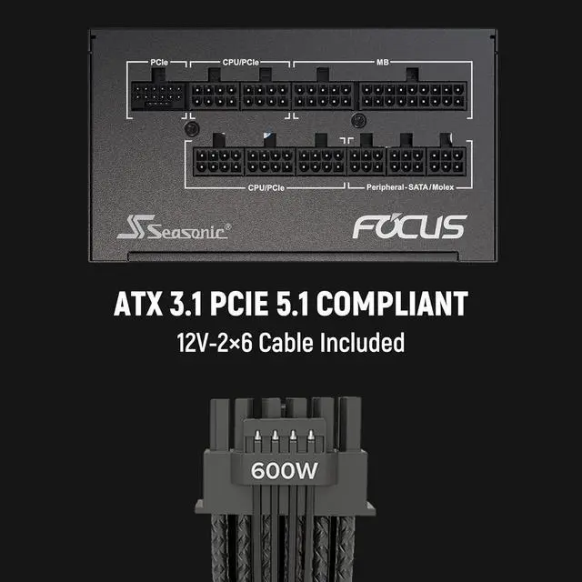 High Efficiency, 80 PLUS® Gold Certified ATX 3 and 16-Pin PCIe Gen 5 Cable (12V-2x6) OptiSink Design Fully Modular Cabling Design Compact Size (140 mm) 135mmFluid Dynamic Bearing(FDB) Fan Seasonic Hybrid Silent Fan Control Highly Reliable Japanese 105 °C Aluminum Electrolytic Capacitors Tight Voltage Regulation (12 V, 5 V and 3.3 V) [± 3 %] Ample +12 V Output DC to DC Converter Design Cable-free Connection Design Gold-Plated High Current Terminals (MB, CPU and PCIe PVC Embossed Cable 10 Years Warranty