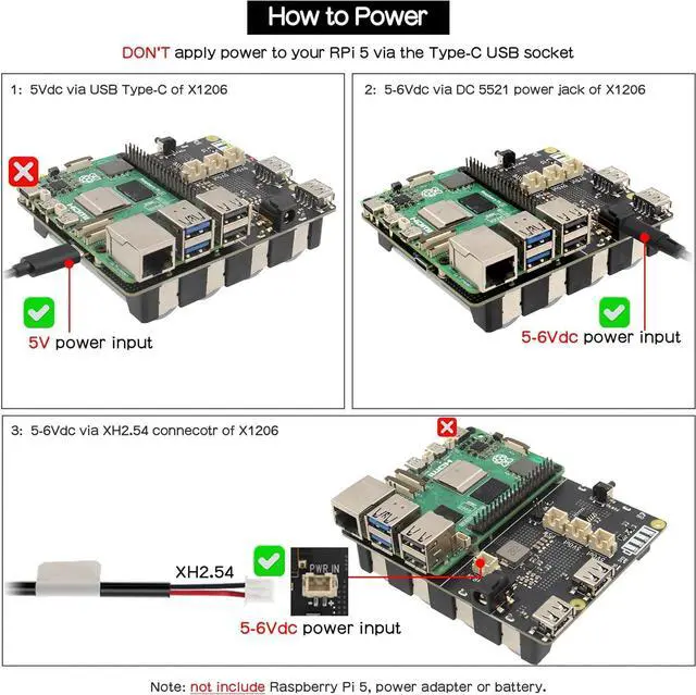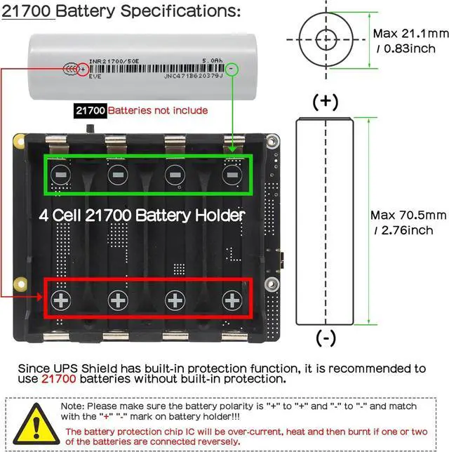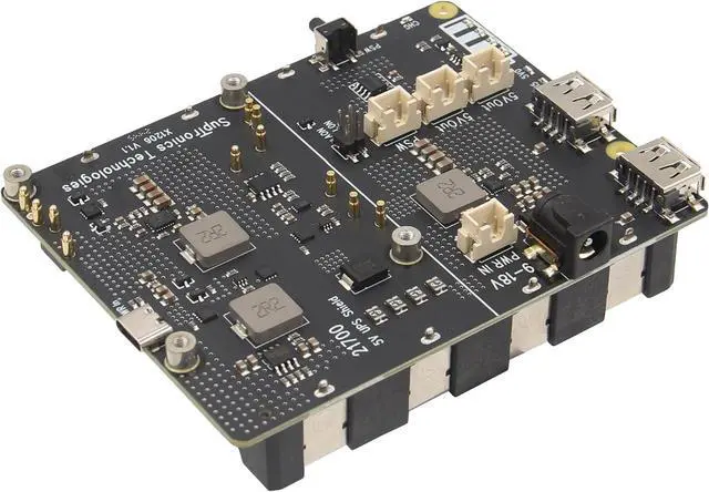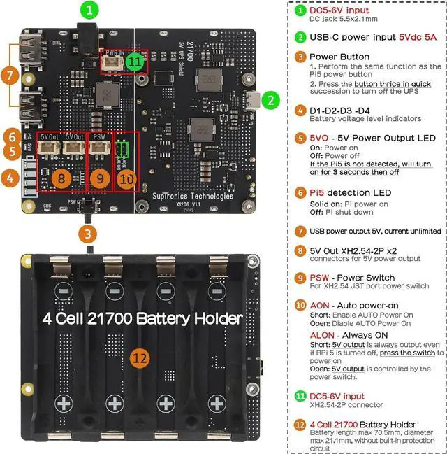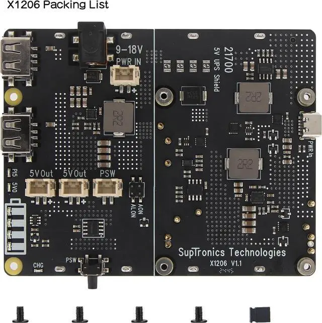 This X1206 is an ultra-compact advanced uninterruptible power supply expansion board designed specifically for the Raspberry Pi 5. It features a 4-cell Lithium 21700 battery holder, supporting up to 10,000mAh (with 4 cell 21700 batteries), with its advanced features and robust power backup capabilities, the X1206 is perfect for even the most demanding Raspberry Pi setups.