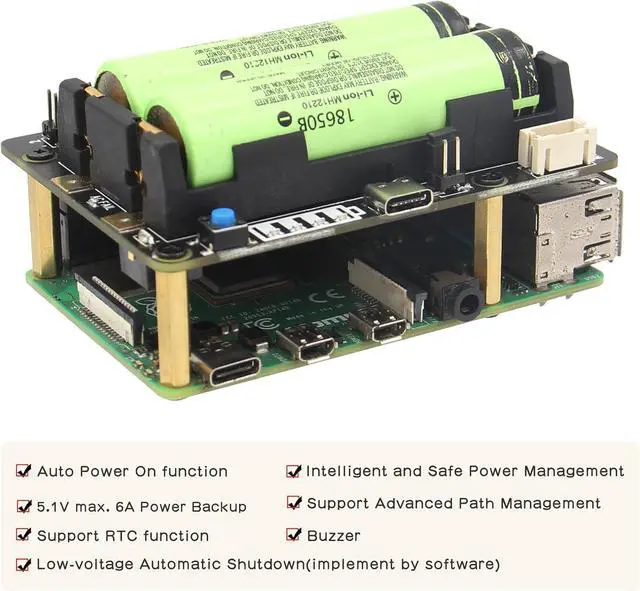 Function: X728 provides 5.1V 6000mA Power Backup, intelligent and safe power management, safe shutdown, auto power-on, full poweroff from software,Battery capacity reading, Low battery automatic shutdown, Buzzer alarm, RTC