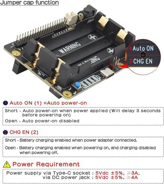 Important Note: 1. Do not apply power to your RPi via the Micro USB or USB Type-C socket. 2. Do not use battery with built-in protection circuit. 3. Please make sure the polarity of battery is "+" to "+" and "-" to "-" and match with the "+" "-" mark on battery holder