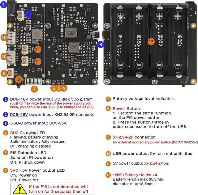 Compatibility: Pi 5 UPS compatible with Raspberry Pi 5 16B / 8GB / 4GB; Model: X1202; Matching Case is X1202-C1