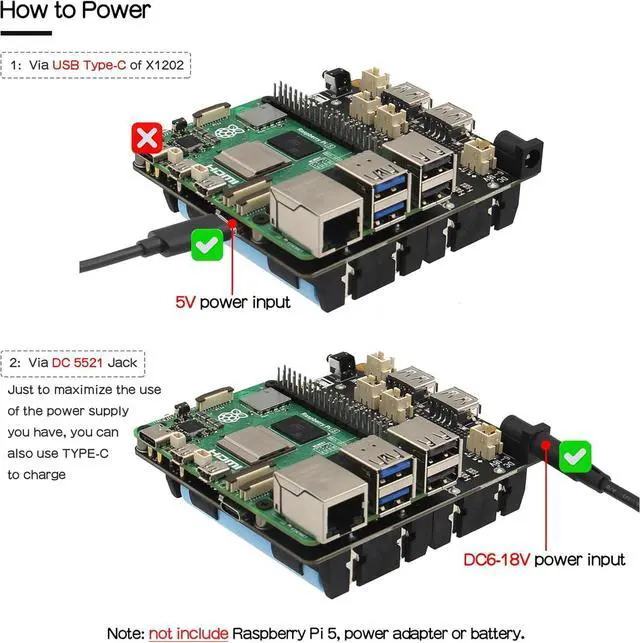 How to Power: Power via USB-C port of X1202: 5Vdc 5A via USB Type-C OR Power via DC 5521 power jack of X1202: 6-18Vdc , 3A