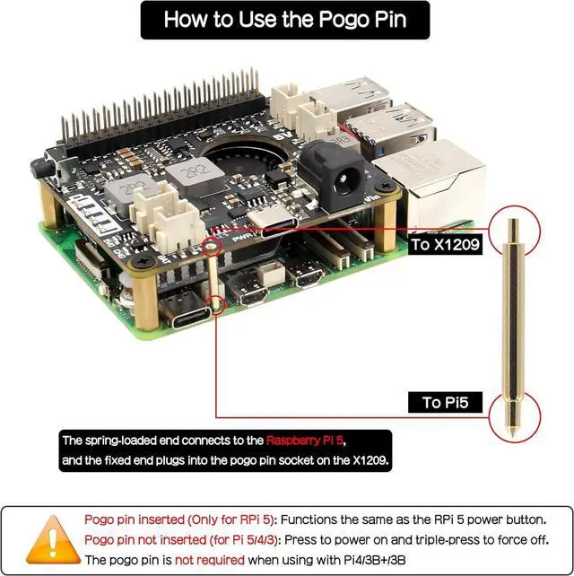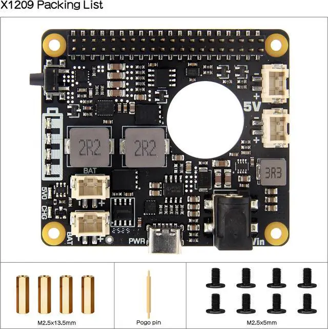 Packing List: 1 x X1209 V1.0 expansion board, 4 x M2.5x13.5mm F/F Spacers, 8 x M2.5x5mm Screws, 1 x Pogo pin(For connecting to the Pi 5 PSW through hole)