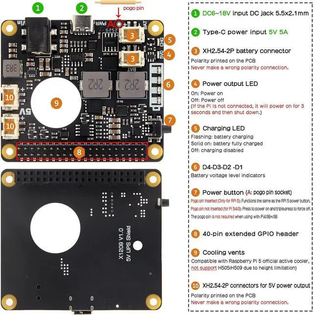 Function: X1209 Supports a maximum current output of 5.1V 6000mA, intelligent and safe power management like auto power on, safe shutdown, full power-off from software, power loss and power adapter failure detection, on-board power button to power on/off