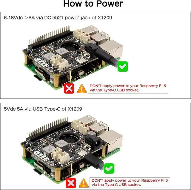 How to Power: 1. Power 5Vdc 5A via USB-C port of X1209 OR 2. Power 6-18Vdc via DC jack of X1209 (12Vdc 3A power adapter recommended)