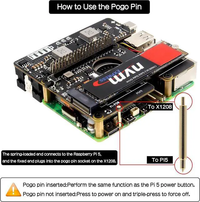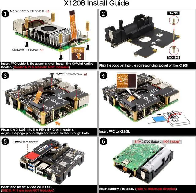 Packing List: 1 x X1208 V1.0 UPS+NVMe board, 2 x 40mm length PCIe FFC cable(one as backup), 4 x M2.5x13.5mm F/F Spacers, 8 x M2.5x5mm Screws, 1 x Pogo pin(For connecting to the Pi 5 PSW through hole), 1 x SSD Copper Pillar, 1 x M2x4mm Screw