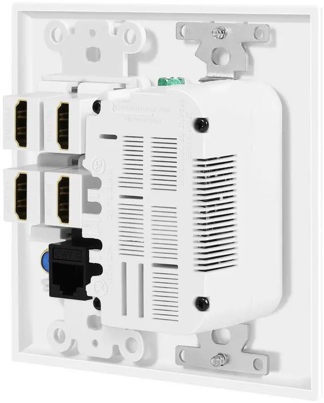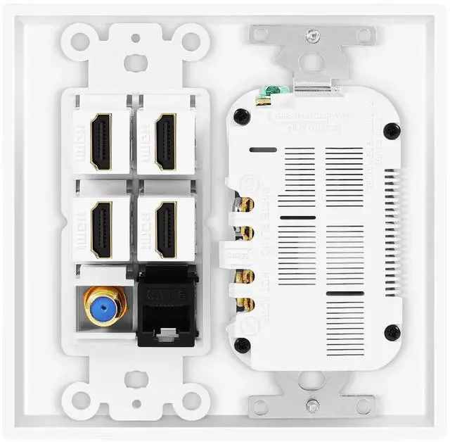 HDMI Outlet Port & Coax Wall Outlet - includes dual 15A power outlets, 4 HDMI ports, a Cat6 RJ45 Ethernet port, a coaxial cable outlet, keystone jack, and 2 USB-A ports. The HDMI and cable wall outlet caters to all your connectivity needs in one location