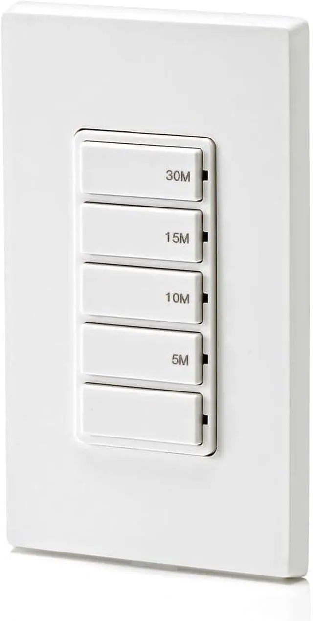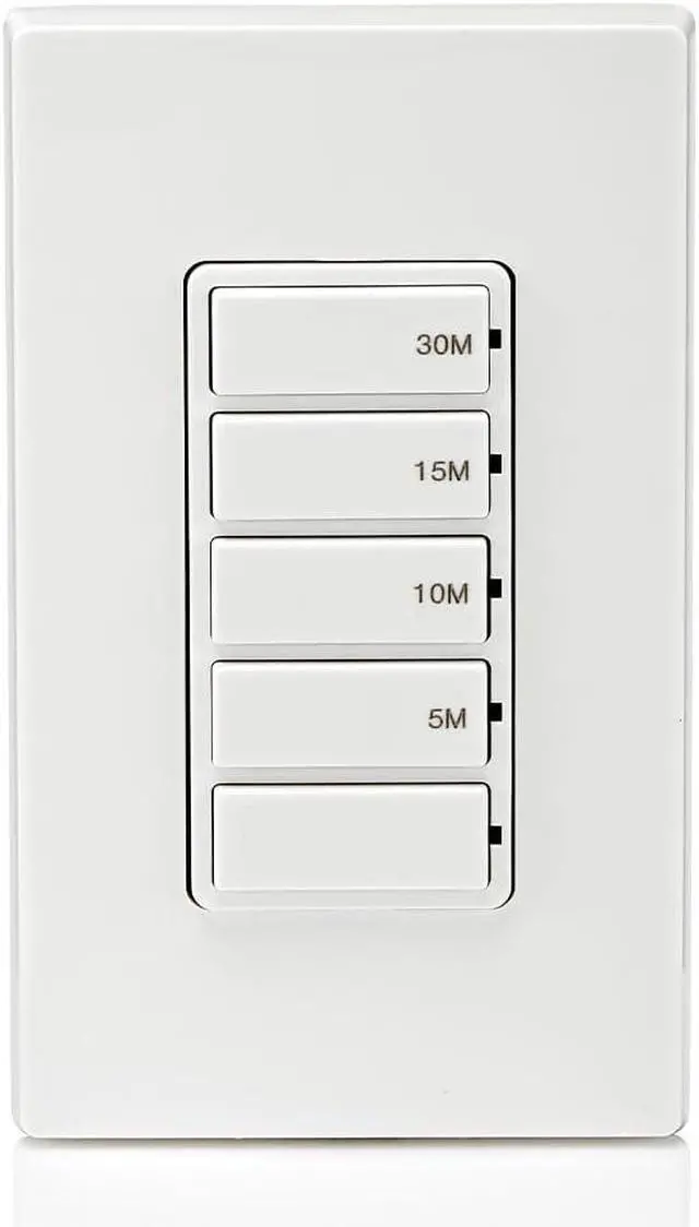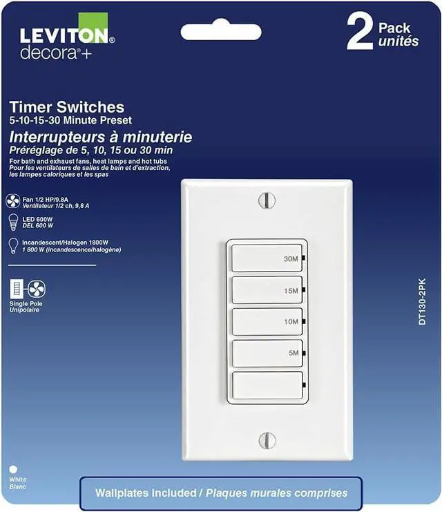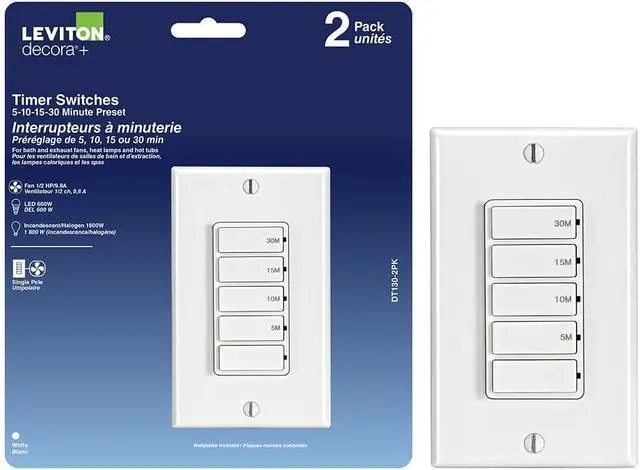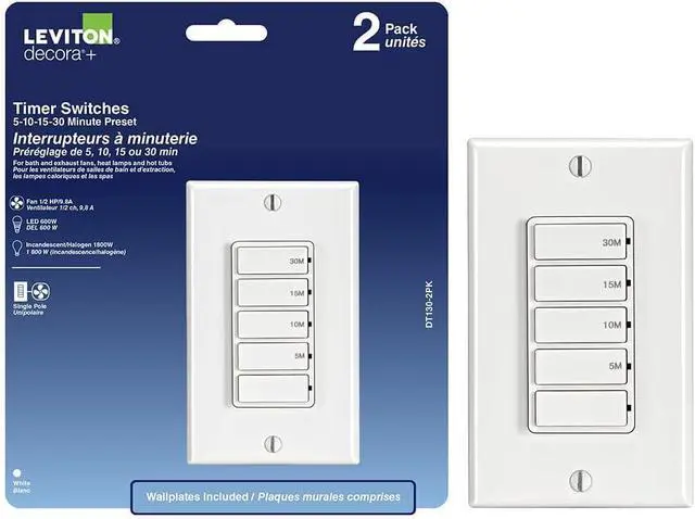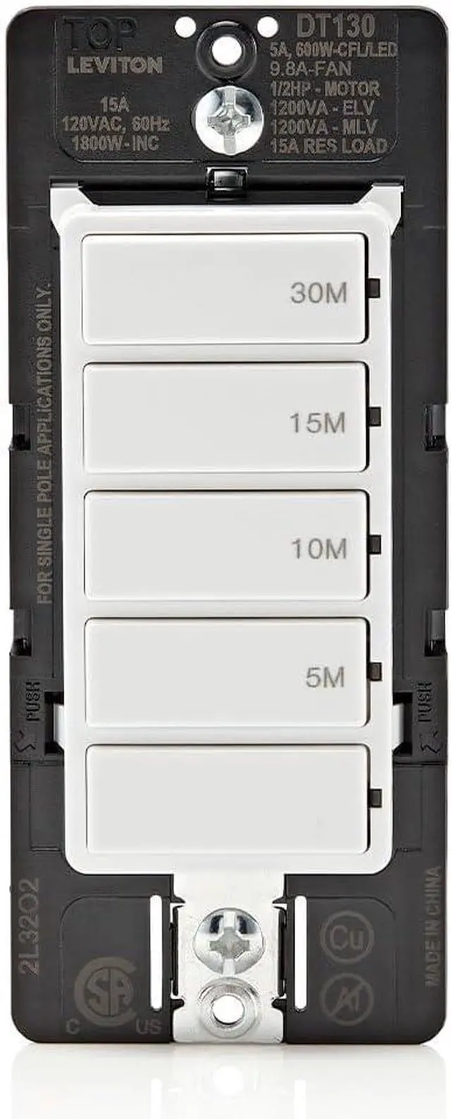 The Decora 30-Minute Countdown Timer Switch has 5 buttons with 5-minute, 10-minute, 15-minute and 30-minute preset time options and a manual off button. Single Pole, 600W LED/CFL, 1800W Incandescent/Halogen, 1200VA Magnetic Low Voltage/Electronic Low Voltage/Fluorescent, ½ HP/9.8A Fan/Motor, 15A Resistive. Can be installed with or without a neutral wire, wallplate sold separately - White