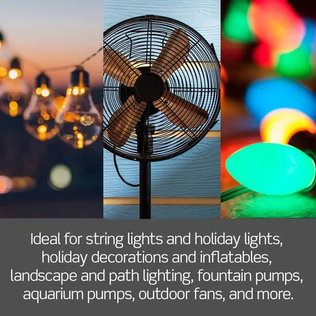IDEAL FOR OUTDOORS: ON/OFF control of string lights and holiday lights, holiday decorations and inflatables, landscape and path lighting, fountain pumps, aquarium pumps, outdoor fans, and other electronics and small appliances