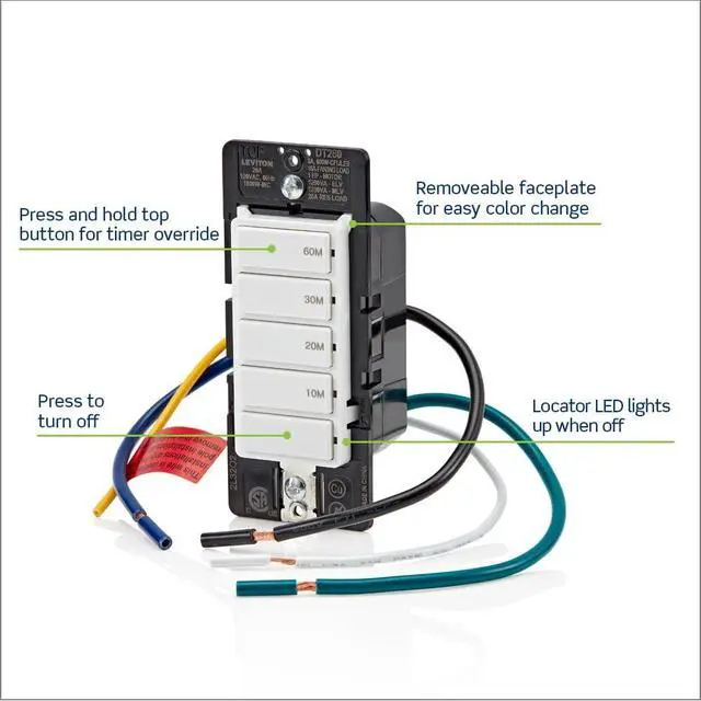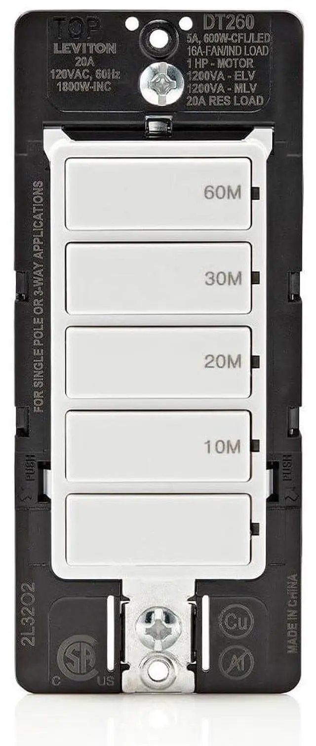 Levitons 60-Minute Countdown Timer Switch has 5-buttons with 10-minute, 20-minute, 30-minute and 60-minute time options and a manual off button. The larger load capacity can handle larger fixtures and fans. Single pole, multi-way using DD0SR Switch Companion or multi-timer using two DT260 countdown timers. The appearance complements interiors and is compatible with other Decora devices. Easy to change colors using DTKIT faceplates available in white, ivory, light almond, gray, black and brown. Ideal for porch and landscape lighting, interior lights, bathroom exhaust fans, heat lamps, pool pumps, hot tubs, saunas, attic fans and more. Do not use to control lights if it is the only light source in the area. Use with Decora wallplate and Decora Plus Screwless Wallplate sold separately. Decora Countdown Timer Switch 600W LED/CFL, 1800W Incandescent/ Halogen, 1200VA Magnetic Low Voltage/Electronic Low Voltage/Fluorescent, 1 HP/16 Amp Fan/Motor, 20A Resistive/16A Inductive, neutral wire required, wallplate sold separately White