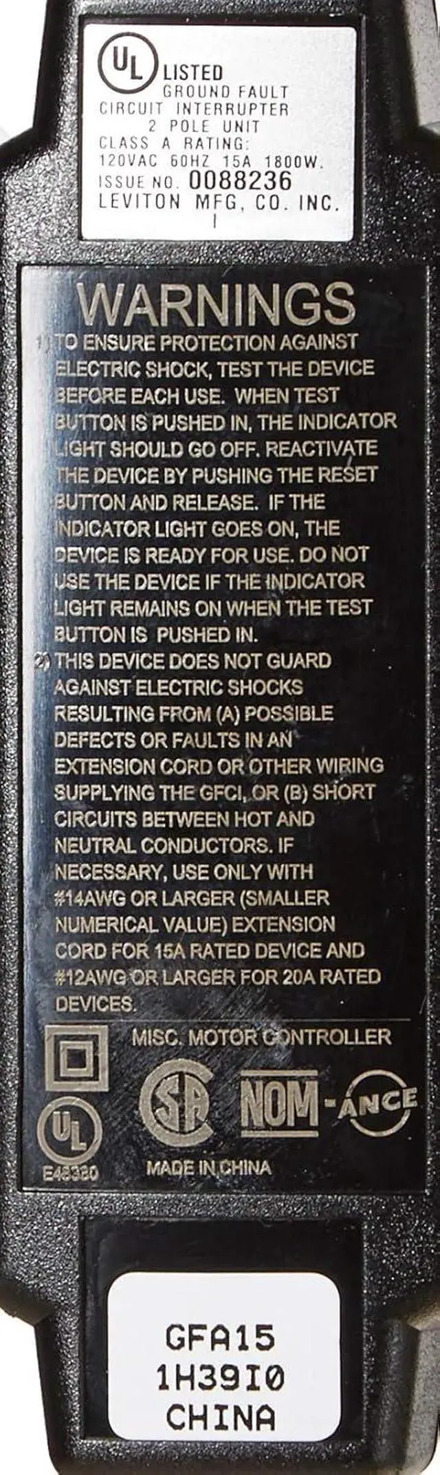 Open-Neutral Protection immediately trips the GFCI if the neutral conductor on the line side is opened, eliminating the possibility of the GFCI Cord Set having a live hot leg