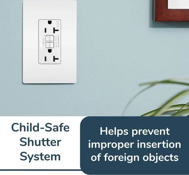 Protect your child with this patented shutter system which helps prevent improper insertion of foreign objects meeting national electrical code tamper-resistant requirements