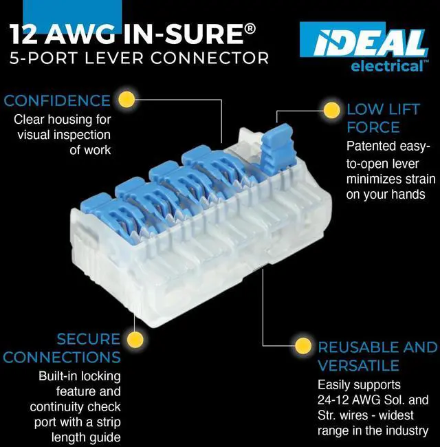 PACKAGE INCLUDES: Box of 75 In-Sure Lever Connectors, 12 AWG, 5-Port