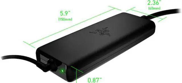 The Razer 165W power adapter fuels the machine that runs all your next-gen games, intensive applications, and media content. Measuring at an incredible 0.87 inches thin and weighing only 348g, the innovative Razer 150W power adapter, like the laptop it supports, was designed from the ground up to deliver performance in an ultra-portable form factor.