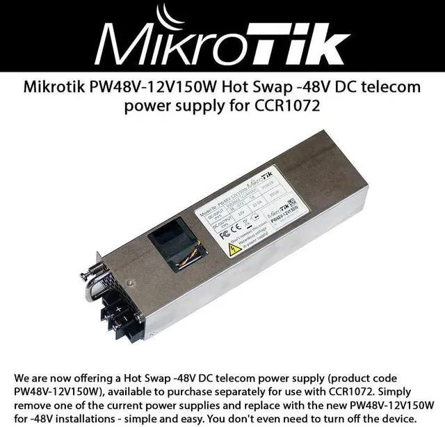 We are now offering a Hot Swap -48V DC telecom power supply (product code PW48V-12V150W), available to purchase separately for use with CCR1072, our newest flagship CCR2216 or even the CRS518. Simply remove one of the current power supplies and replace with the new PW48V-12V150W for -48V installations - simple and easy. You don't even need to turn off the device. Supports Voltage -36 .. -57V