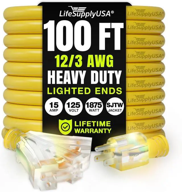 Durable Performance Rely on the LifeSupplyUSA Heavy Duty Outdoor Extension Cord for unmatched durability and reliability, whether at home, work, or on a construction site. Engineered to perform in harsh conditions, this indoor & outdoor heavy duty extension cord 3 prong model withstands extreme temperatures and features a waterproof design, ensuring it lasts through any challenge. Built with a robust vinyl jacket, the three prong extension cord resists oil, grease, moisture, and abrasion, protecting against electrical hazards and wear. The durable construction of the power cord extension not only ensures safe operation across diverse environments but also contributes to the cord's longevity, making it a dependable choice for any task. Outdoor Electric Cord with Enhanced Visibility The lighted end of the indoor & outdoor electrical cord indicates power while the brightly colored PVC jacket improves visibility, minimizing tripping hazards in busy or dimly lit areas. This feature enhances safety and makes the electric cord extension easily identifiable among other tools, preventing accidental disconnections and ensuring smooth operation. Versatile and Powerful Electric Cords From powering heavy-duty equipment like drills and saws to lighting up your holiday decorations, LifeSupplyUSA Indoor & Outdoor Extension Cords are versatile enough to handle it all. Whether tackling major construction jobs, home renovations, or casual outdoor setups, this outdoor waterproof extension cord adapts seamlessly to your needs. Certified for Optimal Performance This 100 ft,12 Gauge, 3-Outlet SJTW waterproof outdoor extension cord supports 15 AMPs, 125 Volts, and up to 1875 Watts, the heavy duty drop cord extension power cord is designed for extra safety and robust performance, capable of powering high-demand equipment with ease and reliability.