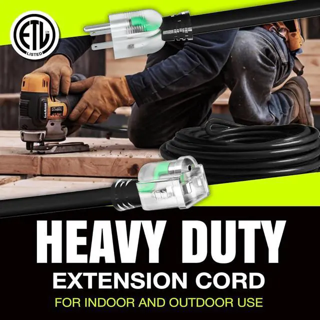 LIGHTED END FOR VISIBILITY & SAFETY: With a lighted end to indicate power and a brightly colored PVC jacket, this three prong extension cord minimizes tripping hazards and improves safety in busy or poorly lit areas. Stay safe while powering up with an easily noticeable extension cable. The innovative design not only enhances operational safety but also ensures that the indoor / outdoor power cord is easily identifiable among your tools and equipment, preventing accidental disconnections.