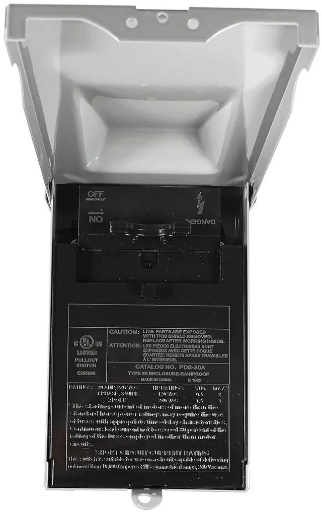 UL Listed; Metal Box, 120/240VAC, 30-Amp, 1-Phase, 3-Wire, 2-Pole, Type 3R; Enclosure-Rainproof; 1 Year Warranty! Please note, the fuse is not included in the package. There is a fuse mounting position inside the unit. The fuse needs to be purchased and installed separately.