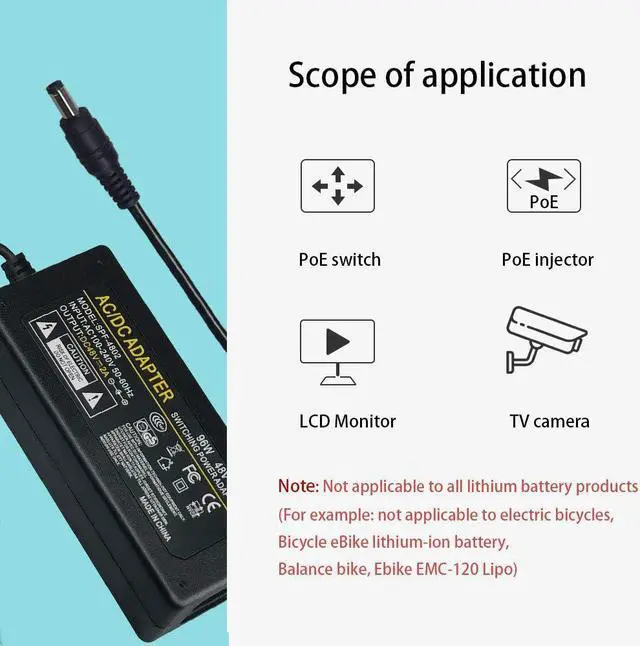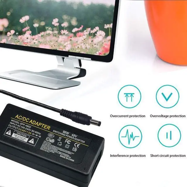 The parameters of 48V 2A adapter: AC input 100-240V 50 60Hz, DC output 48V 2A; wide voltage input, in line with global standards