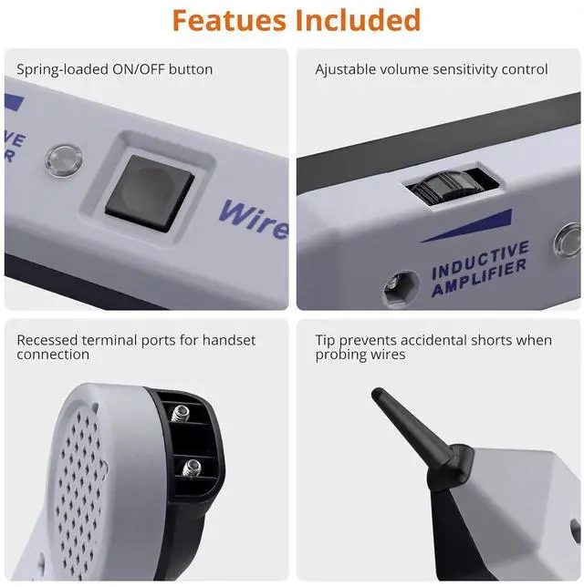• Safe to UseThe cable carbon tracer is equipped with a spring-loaded on/off button; adjustable volume sensitivity control; recessed terminal port for connecting to the handset; resistive plastic carbon fiber tip prevents the probe from accidentally shorting out when probing wires. The insulated probe and built-in speaker prevents wires from shorting out, making the network audio generator and probe kit safer to use