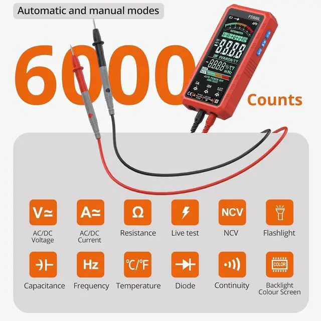 True-RMS 6000 Counts Auto/Manual Range--- 6000 Counts Multi Meter Supports True-RMS Measurement And Auto/Manual Modes To Select; Automatic Current Jack Recognition Function ( In Auto Mode, The Test Pen Is Inserted Into The Current Jack And The Current Test Mode Is Automatically Selected)