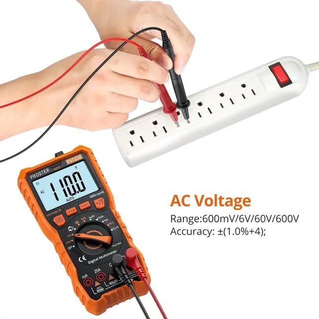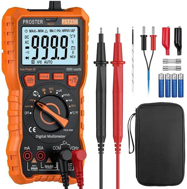 Proster TRMS Multimeter: With high precision and high performance can measure AC/DC voltage, AC/DC current, resistance, capacitance, frequency, duty ratio, temperature. It also can test NCV, diode, transistor and continuity