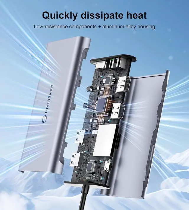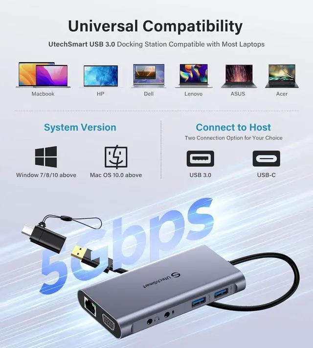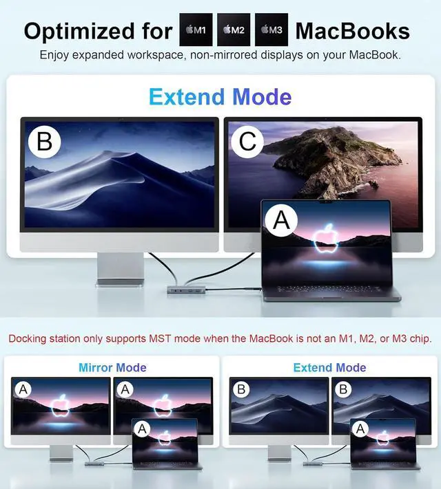 This usb 3.0 docking station is compatible for M1/M2/M3 MacBook, more powerful and stable with the ports of connectivity, supports triple Monitors for MacOS and Windows, dual monitor non-mirror expended. You can expand your laptop's desktop to dual or triple displays at once to increase work and study productivity, make you start a more intelligent life.