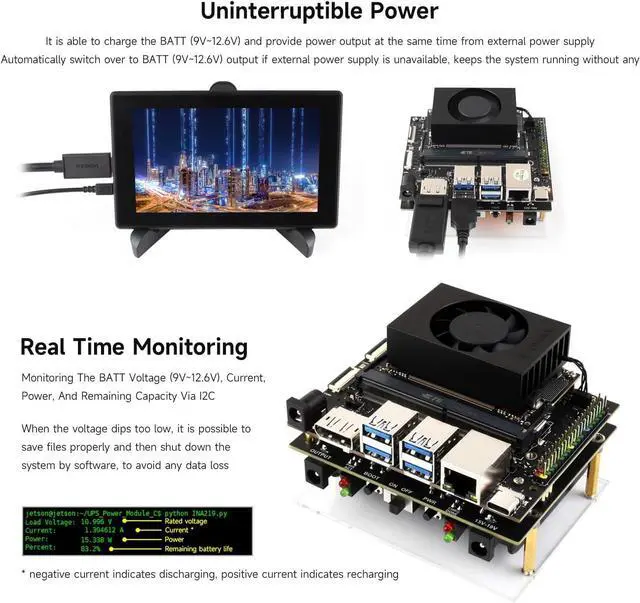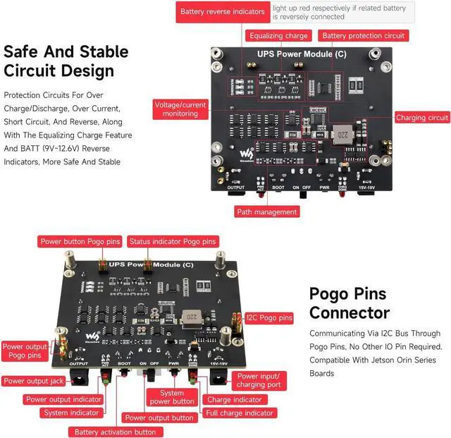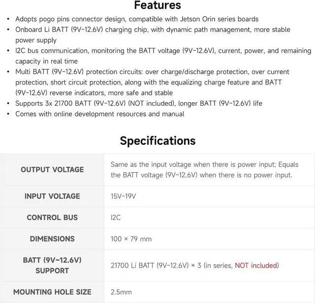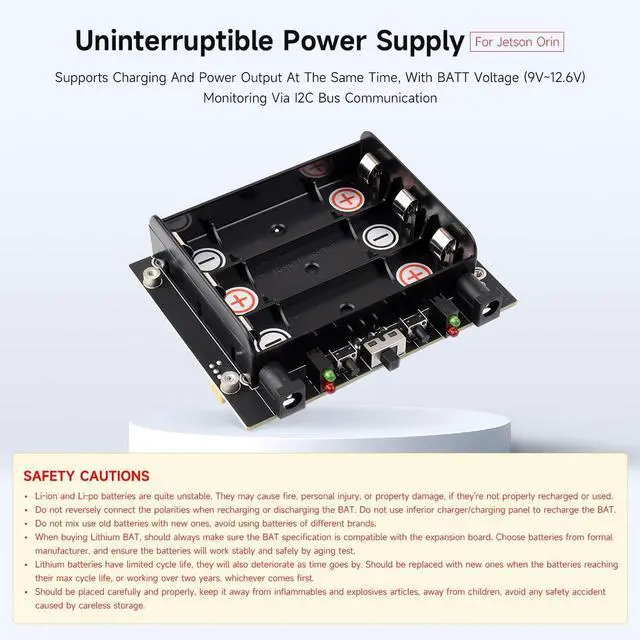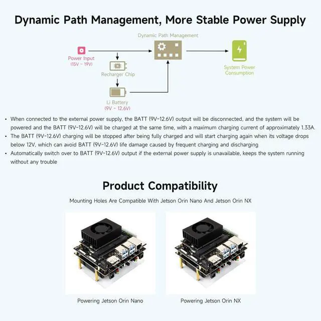 Adopts pogo pins connector design, compatible with Jetson Orin series boards. Onboard Li battery charging chip, with dynamic path management, more stable power supply