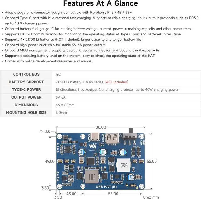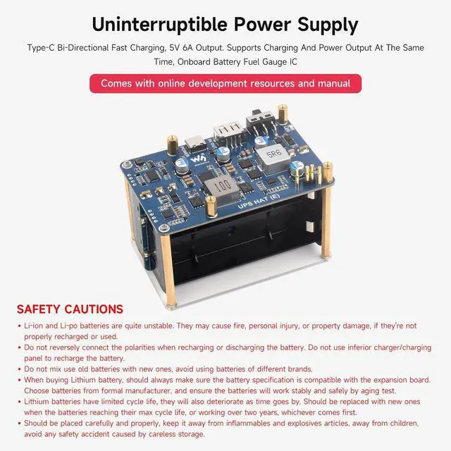 Onboard Type-C port with bi-directional fast charging, supports multiple charging input / output protocols such as PD3.0, up to 40W charging power. Onboard battery fuel gauge IC for reading battery voltage, current, power, remaining capacity and other parameters.