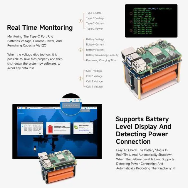 Supports I2C bus communication for monitoring the operating status of Type-C port and batteries in real time. Supports 4× 21700 Li batteries (NOT included), larger capacity and longer battery life
