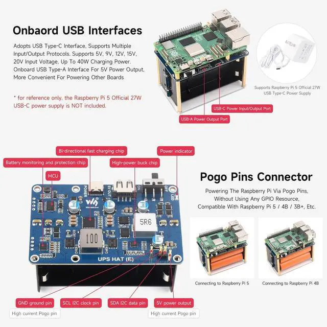 Adopts pogo pins connector design, compatible with Raspberry Pi 5 / 4B / 3B+