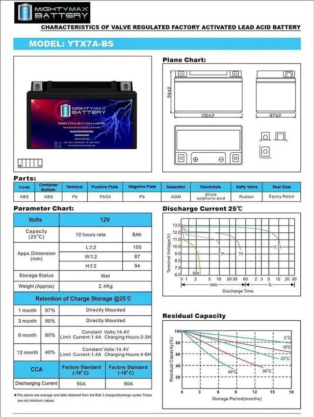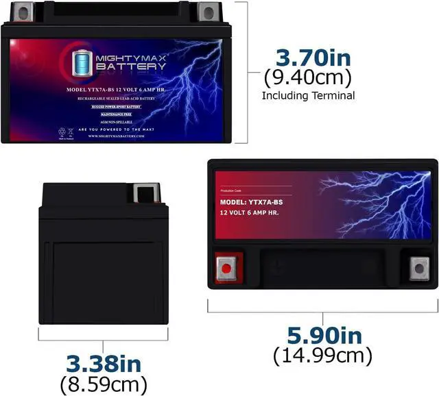 • YTX7A-BS is a 12V 6AH 105 Cold Cranking Amps (CCA) Sealed Lead Acid (SLA) Battery