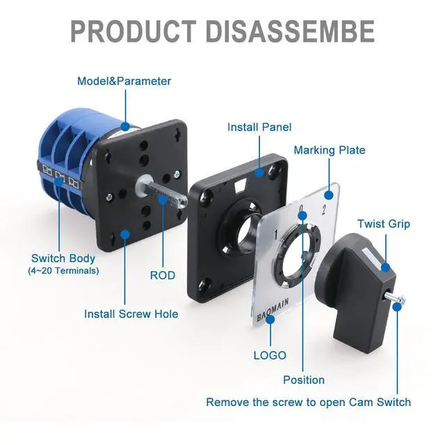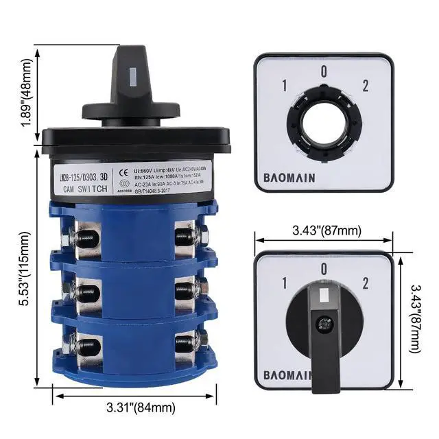 Baomain 125A Rotary Cam Changeover Switch, 660V ON/Off/ON 3 Position, 3-Phase 12 Terminals, Selector Switch SZW26-125/D303.3 (LW28-125/3)