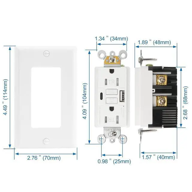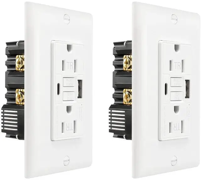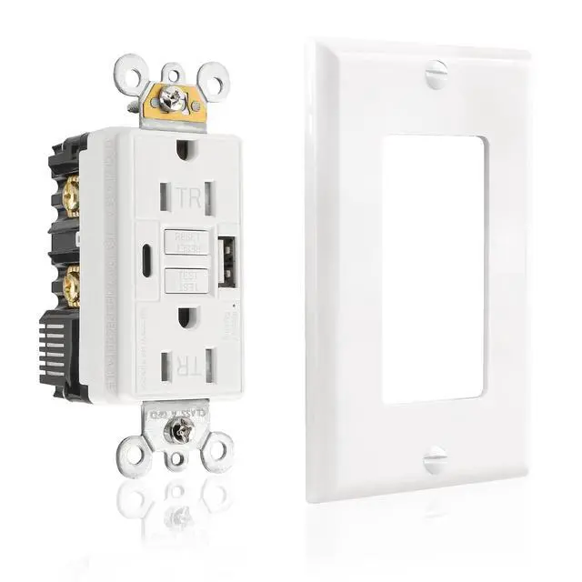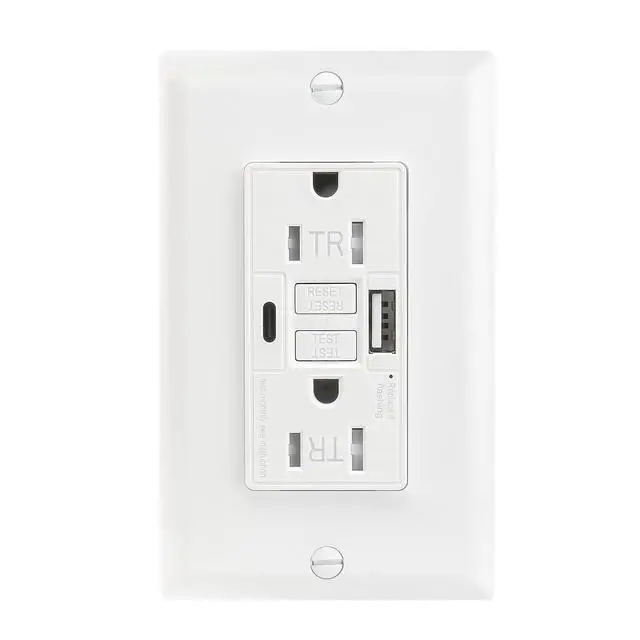 GFCI Protection with USB-A & USB-C Charging - This 15A outlet combines GFCI safety with two charging ports (1 USB-A and 1 USB-C, 5V/4.8A total output) for charging phones, tablets, and other USB-powered devices. Ideal for kitchens, bathrooms, and other damp locations