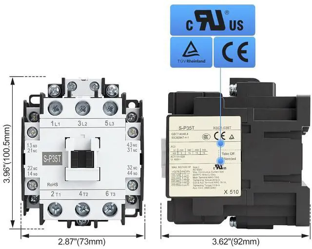 • UL Listed and CE MarkedThis contactor is UL Listed and CE marked, confirming compliance with specific safety standards for use in North America and international markets