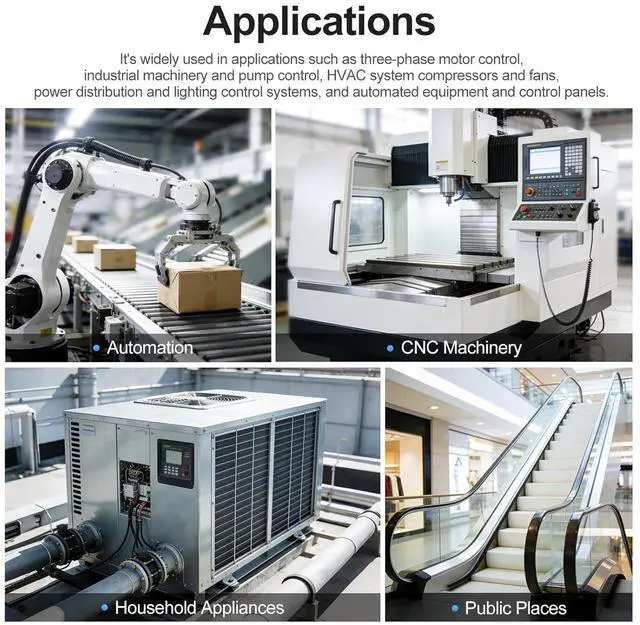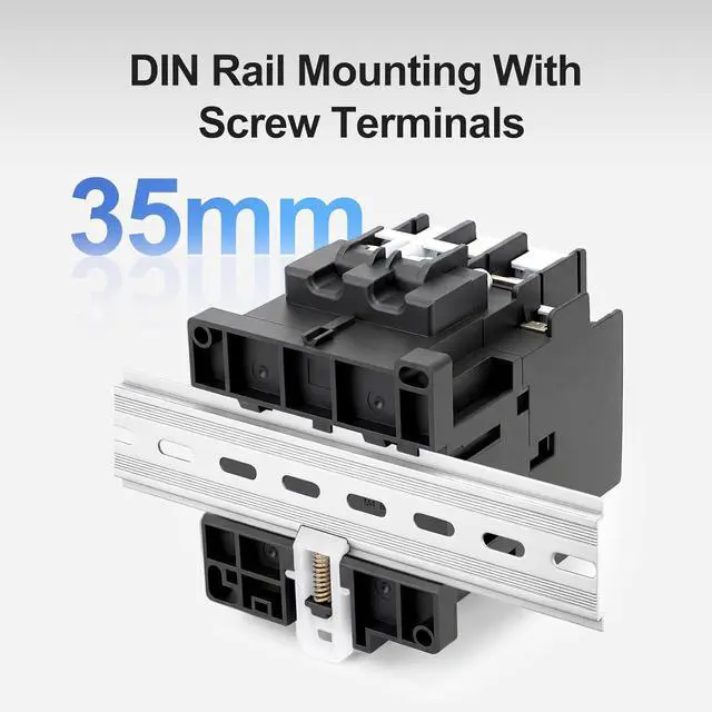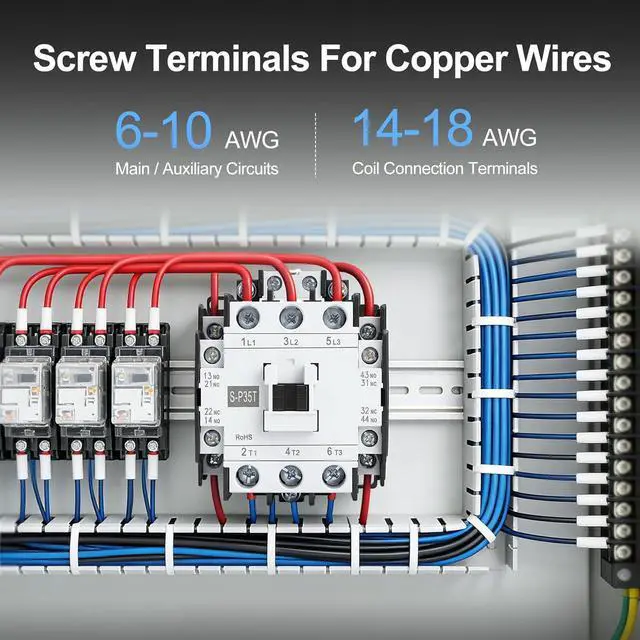 DIN Rail Mounting with Screw TerminalsDesigned for easy installation on standard 35mm DIN rails, ensuring a neat and organized setup in control panels. The screw terminals accept copper wires: 6-10 AWG for main and auxiliary circuits, and 14-18 AWG for the coil connection