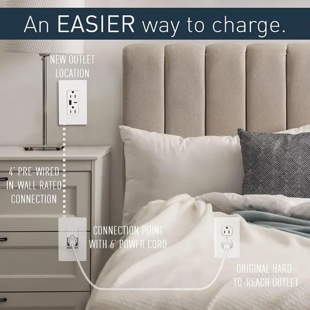 When it comes to your home, shouldnt the power access you need be exactly where you want it? With the new In-Wall Outlet Relocation Kit, its easy to take the power from those hard-to-reach outlets behind the couch or dresser, and put it easily, and aesthetically, within reach. Go where extension cords cant, no electrician required. DIY-friendly, this kit is designed to meet electrical code and install easily with just a few common household tools, enabling you to extend power behind the wall, up to 6 from the original placement. Finishing off with a radiant Outlet in your preferred location, the tamper-resistant solution features the designer style of all radiant devices. Make the move to put your power where you want it, and upgrade your space with added style, function and convenience.