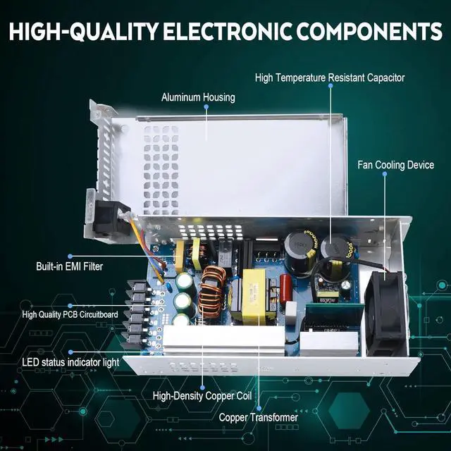 Important Notes: The new model switching power supply is equipped with an advanced intelligent temperature control fan that automatically senses temperature changes and starts up when the temperature exceeds 45°C, effectively preventing circuit board overheating and damage