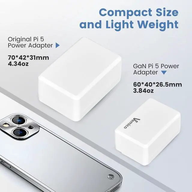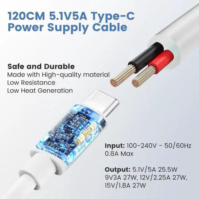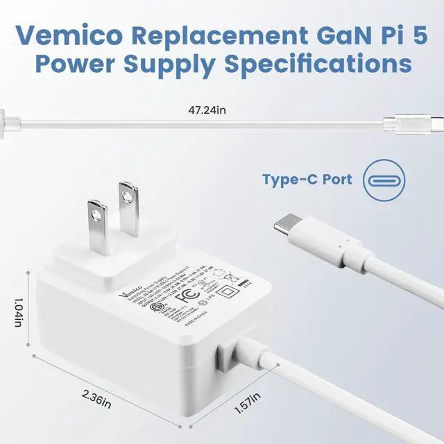 Standard: 27W 5.1V 5A power adapter for Raspberry Pi 5 16GB/8GB/4GB Board. Output: DC 5.1V/5A Input: AC100-240V. Type-C connector for more electronics.