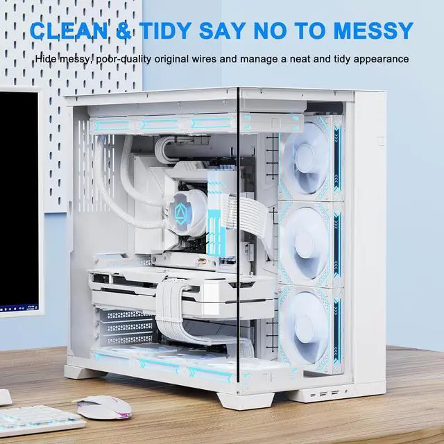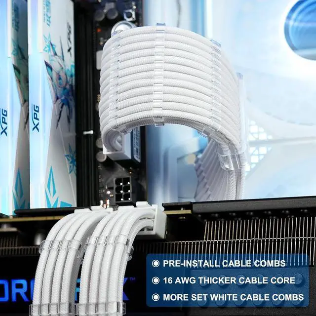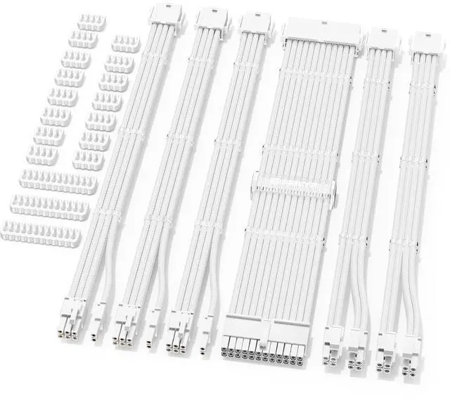 Step up your PC build game with Sirlyrs White PSU Cable Extension Kit.With an all-white design and glossy nylon braided cables,this kit enhances the look of your desktop system while ensuring optimized performance.The pre-installed cable combs enable easy cable management,and the gold-plated terminals ensure stable current transmission,ideal for high-end gaming and DIY setups.The thickened alloy copper core conforms to the highest PC power supply standards,maintaining stability even under high current.This makes it capable of supporting power supplies ranging from 800W to 1600W effortlessly.Our comprehensive kit includes ATX 24 pin x 1,4+4 pin EPS x 2,6+2 pin PCI-E cables x 3,plus an additional set of combs,providing a simple and effective solution for extending the reach of your original power supply cables. Trust Sirlyr for your PC cable needs Upgrade to the Sirlyr White PSU Cable Extension Kit today and power your high-end PC setup with style and confidence!