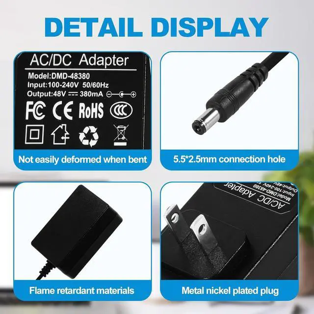 48-volt power supply adapter comes with multiple safety measures, such as protection against excessive voltage, current, temperature, and any short circuits.
