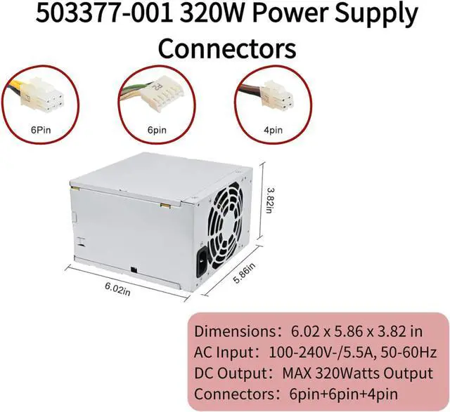 This is LXun Upgraded New 320W D10-320P2A Power Supply Compatible with HP MT 6000 6200 6300 8000 8200 Z200 CFH-0320EWWA DPS-320NB Power Supply Replacement Part Numbers: 503377-001 611484-001 613764-001 613765-001 power supply. Model: DPS-320NB Applicable Models: HP MT series (6000 6005 6200 6060 6080 6280 6300 6380 8000 8080 8100 8180 8200 8280 8300 8380) and other models and Z200, Z210 workstation, HP EliteDesk 800 G1 600G1 Tower PC large chassis power supply. Fits These Parts Numbers: 503377-001/508153-001, 503378-001/508154-001, 611483-001/613764-001, 611484-001 613765-001, 707818-002/707906-001 and so on. Power Supply Model: D12-320P1A D12-320P1B D10-320P2A CFH0320AWWA HP-3201AO HP-D3201EO PS-4321-9HP PS-4321-9HA DPS-320JB A DPS-320MB A DPS-320NB A PC8022 and so on Input: 100-240V / 5.5A, 50Hz-60Hz Output: -12V/0.15A, +12Vsb/1.3A Power strip interface: 4P*1, 6P*1, P2*1 Warm-Tips: Three kinds of connectors for the cable pin, only used in the original HP chassis, the ordinary motherboard can not be used.