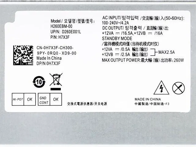 The New LXun Upgraded 260W H260EBM-00 PSU Power Supply Compatible with Dell Optiplex 3060 3050 3050M 5050 5060 7050 7060 3080 5080 7080 5090 7090 7080MT H7X3F Switching Power Supply, Connector: 6Pin+4Pin. CompatibilityH260EBM-00 PSU 260W Power Supply Compatible with Dell Optiplex 3060 3050 3050M 5050 5060 7050 7060 3080 5080 7080 5090 7090 7060MT 7080MT, Compatible with Dell Inspiron V3668 V3669 Power Supply. Model Number D260E001L H260EBM-00 L260EBM-00 D260EBM-00 H260AM-00 AC260AM-00 B260EBM-00 HU260EBM-00 260W power supply replacement Part Number H7X3F 0H7X3F Switching power supply Input & Output100-240V4.2A(50-60Hz) , DC Output: Max Output 260W. Connector: 6Pin+4Pin Warranty1* H7X3F 260W power supply. 1 Year warranty. 100% new part and high quality. All motor fans are TESTED rigorously before shipping. For any reason you're not completely satisfied, you can ask for a replacement or full refund.