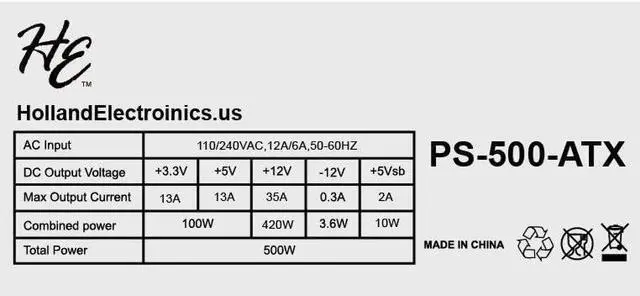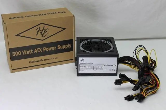 Holland ATX Power Supply Unit - PS500R1-500W - 120mm Ball Bearing Fan - Black with Color