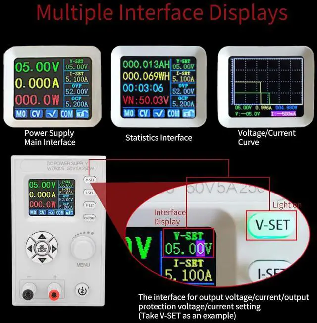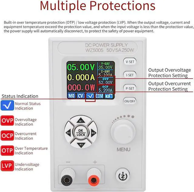 SAFE & RELIABLE: This adjustable switching regulated power supply supports multiple measures. The output overvoltage (OVP)/overcurrent (OCP) data can be set through the buttons on the panel, and it has built-in over temperature (OTP)/undervoltage (LVP). When the output voltage, current and device temperature exceed the value, input voltage is less than the value, the power supply can automatically shut off, which can extend its service life.