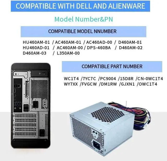 Dell power supply: AC460AM-01, AC460AM-00, AC460AD-00, HU460AD-01, H460AD-00, HU460AM-01, H460EGM-01, DPS-460DBA, D460AM-01, D460AM-02, D460AM-03, L350AM-00, QZLHCHY DM1RW, WC1T4, 7P3WV, 1KG21, 7YC7C, PC9004, 15D8R, CN-0WC1T4,