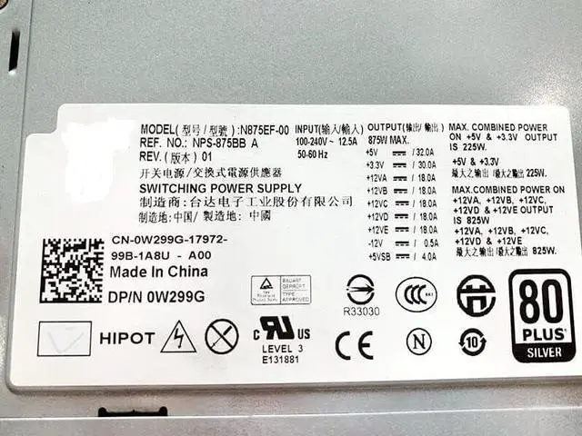 Part Number:NPS-875BB A, N875EF-00 Compatible Part Number : W299G, J556T, U595G NPS-875BB A, N875EF-00, H875EF-00 Model Number : For Dell Precision T5500 T5400 Output Power :875W