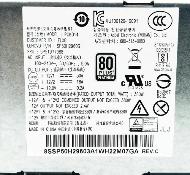 For M80t M80s M70t M90s M70s P340 P350 380W Power Supply PCK014 5P50V03183 5P51D77151 5P51D77088 10+8 Pin