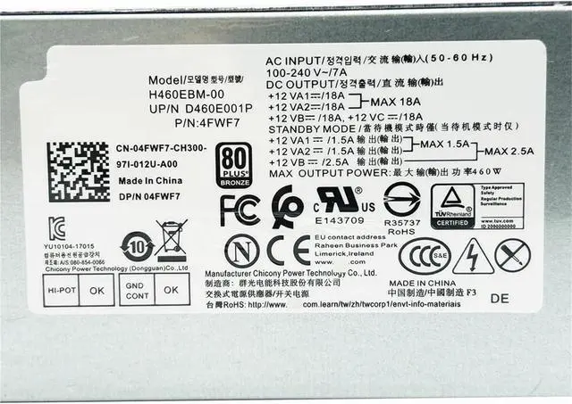 for 3046 3040 3050 5050 7080 MT G5 5090 XPS 8940 460W Power Supply 6+4+4PIN H460EBM-00 D460E001P CN-04FWF7 04FWF7 4FWF7